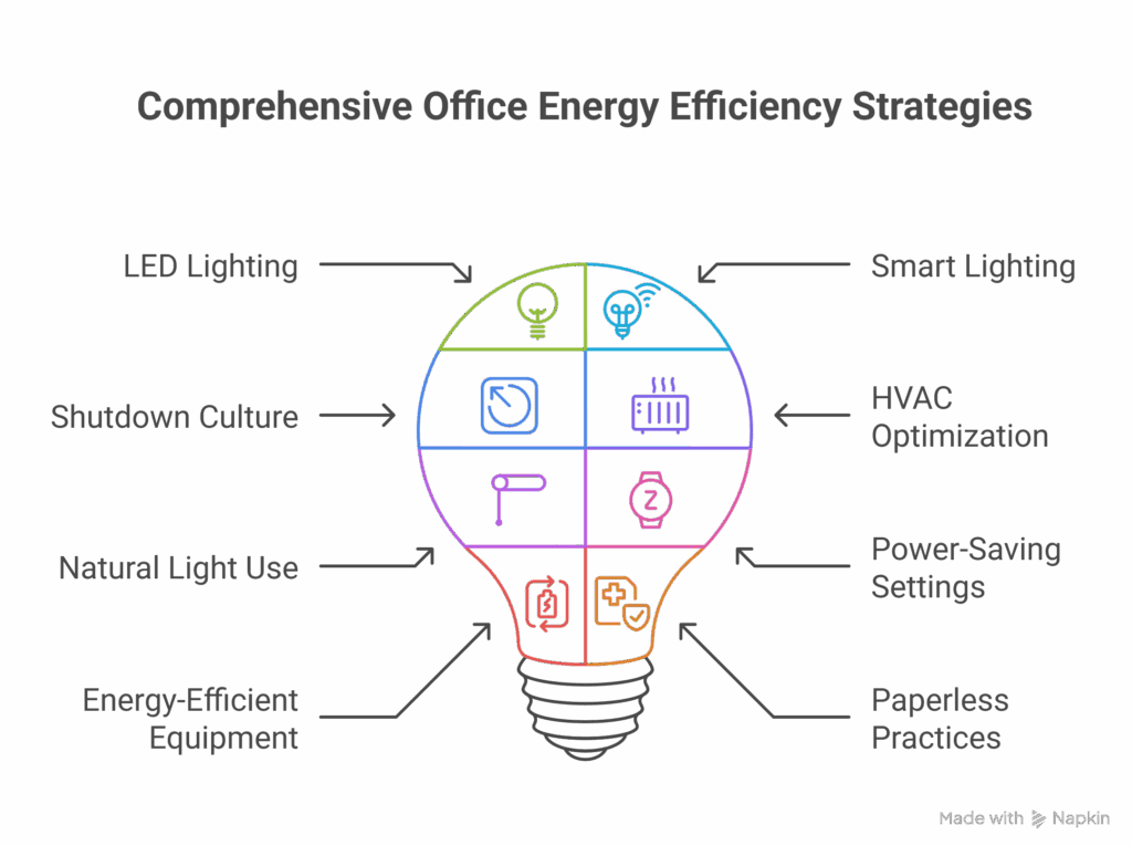Energy consumption in offices contributes significantly to a company’s carbon footprint. Lighting, HVAC systems, electronics, and idle equipment all add to emissions and operational costs. By adopting simple, energy-efficient practices, businesses can not only meet regulatory expectations and stakeholder demands but also create a more comfortable and productive environment for employees.